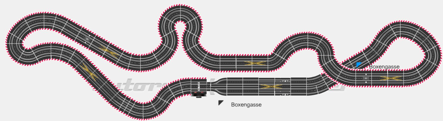 Die Boxengasse ist beidseitig und führt über normale Einfachweichen in den Speedlimiter (Dioden, da Software bei einigen Bahnen zu Fehlern führt, die man im Rennen nicht haben möchte 😊). Knapp 22 Meter, flüssig und doch anspruchsvoll, fast alle Kurven mit wechselnden Radien = Fahrerstrecke.